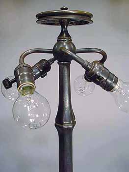 This base is wired according to US safety standards. It comes ready to use in the USA with new old-style cloth covered lamp cord and 4 US turn key lamp sockets. Other standards of electrification are available at no extra cost. The suface of the lamp base and sockets are patinated with brown /dark green- brown Tiffany patina made in our Studio using the original recipe handed down by Tiffany Studios New York. No lacquer is used in the patination process.