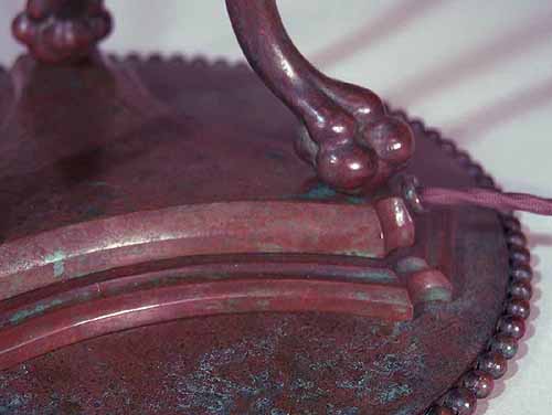 The suface of the lamp base and sockets are patinated with brown /dark green- brown Tiffany patina made in our Studio using the original recipe handed down by Tiffany Studios New York. No lacquer is used in the patination process.
